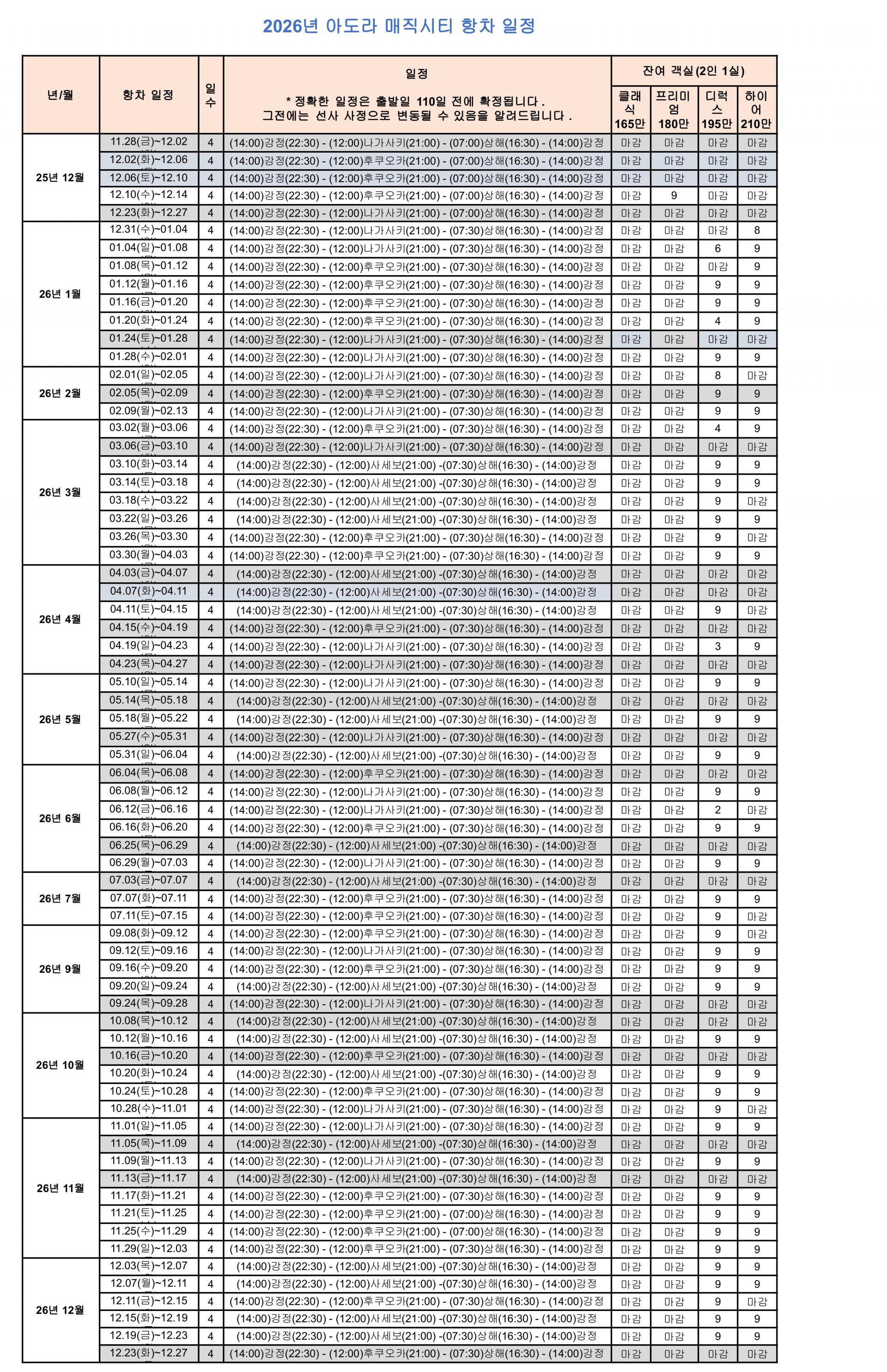 | 여행기간 | 출발일 : 2025년 12월31일[14:00] 아도라 매직시티 도착일 : 2026년 12월27일[14:00] 아도라 매직시티 12월 27일 까지 총 64회 운항 |
